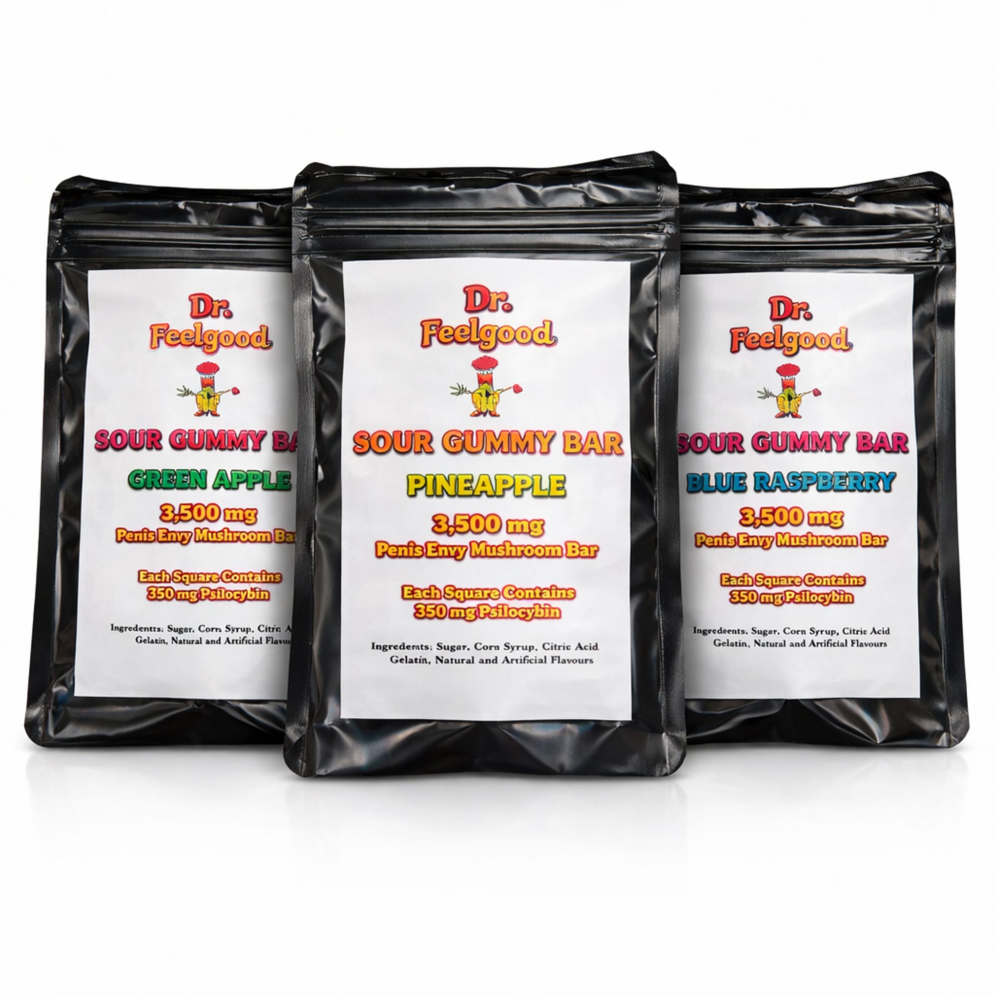 Enjoy a delicious and convenient way to experience psilocybin with Dr. Feel Good’s Sour Gummy Bars, available in Green Apple, Pineapple, and Blue Raspberry. Each bar contains 3500mg of Penis Envy mushrooms, divided into 10 squares, with 350mg of psilocybin per square for easy, controlled dosing.